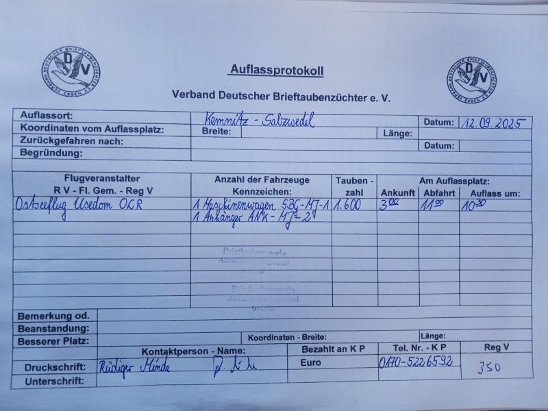 Morgen, am Freitag, den 12. September 2025, steht beim Ostseeflug Usedom der vierte Preisflug auf dem Programm. Der geplante Auflassort ist Kemnitz bei Salzwedel – die Strecke beträgt 230 Kilometer Luftlinie bis zum Heimatschlag.