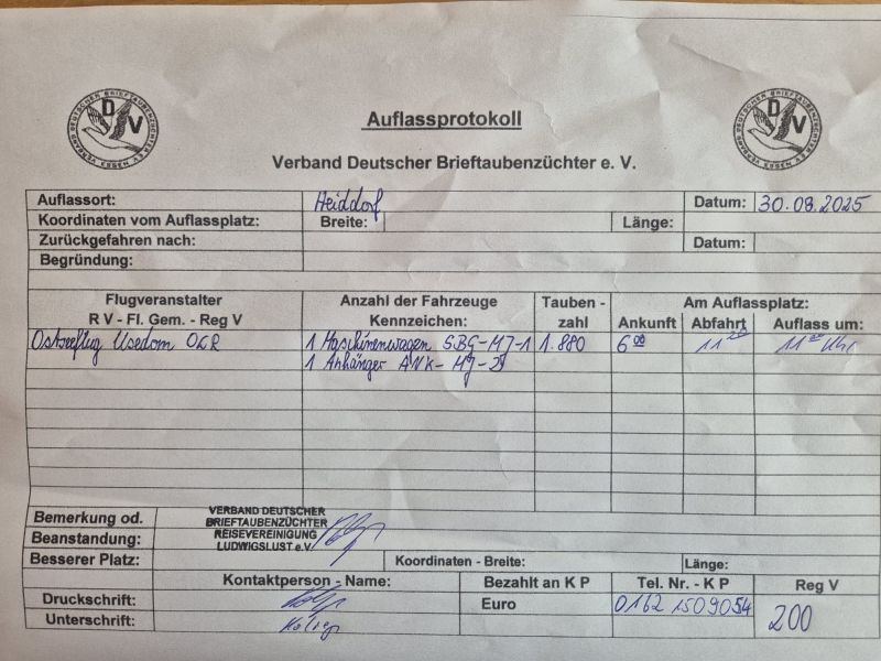 morgen, am Samstag, den 30. August 2025, steht beim Ostseeflug Usedom der zweite Preisflug der Saison an. Der geplante Auflassort ist Heiddorf, eine Strecke von 201 Kilometern Luftlinie bis zum Heimatschlag.