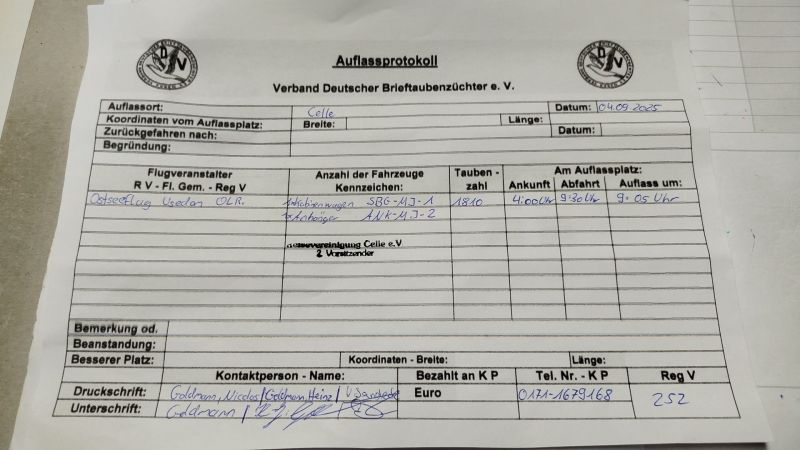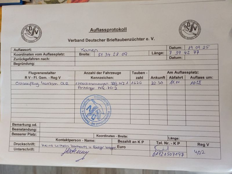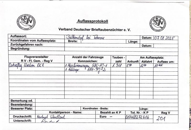 Gemäß den Regularien des Ostseefluges Usedom sind nur Tauben preisberechtigt, deren vollständige Unterlagen vorliegen. Fehlen Abstammungen und/oder Ringkarten, werden diese Tauben von der Preisvergabe und der Versteigerung ausgeschlossen.